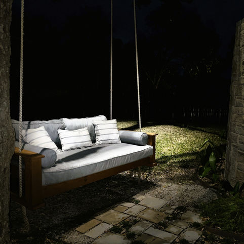 Landscape downlights in the huge Pecan tree illuminate the tree swing off the back patio.